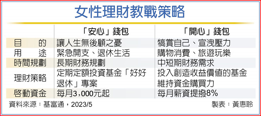 要如何備妥這兩個錢包?王浩宇認為,「安心」錢包為長遠規劃性質,不妨從每個月3,000元開始,定期定額投資共同基金,或參考「好好退休專案」中,由產、官、學專家一致篩選的投資標的,藉由長期穩健的紀律理財,逐步累積人生的財富靠山;「開心」錢包為滿足中短期需求,可從每月薪資或獎金中提撥8%,投入能創造收益價值的基金,維持資金的購買力,未來不管是想要買奢侈品、出國遊玩,都有財力來源,也能避免消費透支,享受美好的人生。