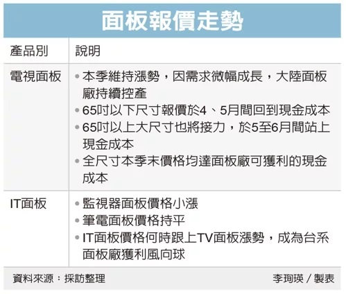 另一家科技市調機構集邦科技(TrendForce)先前發布5月上旬面板報價已為面板廠吹響營運反攻號角。
