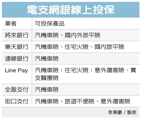 不止純網銀,如LINE Pay、街口及全盈支付等電支業者也跟上線上投保趨勢,與保險公司攜手推出線上投保的服務, LINE Pay表示,目前主要可投保商品除最常見的車險及住宅火險外,還有意外傷害險及實支醫療險也都可以完成線上投保;街口則在意外險及車險外,還提供了旅遊不便險,全盈支付則提供最為基本的汽機車保險。