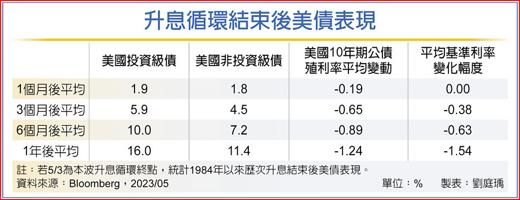 5月份聯準會升息後,美銀美林全球經理人最新調查顯示,超過一半的受訪者認為本波利率調整循環已經結束,第一金投信指出,1984年以來歷次升息循環結束後一年,投資級債券可望迎來多頭行情,市場對於後續貨幣政策寬鬆預期,經濟走緩,帶來避險投資需求等,有機會推動美國高評級債券順風上揚。