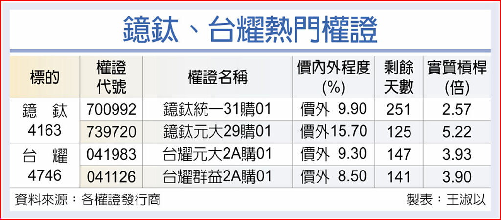 鐿鈦受惠於疫後需求回升、產品組合優化以及新台幣貶值推升毛利率,第一季營業淨利創新高,達1.55 億元,季增43%,年增141%,每股稅後純益(EPS)達2.51元的高水準。