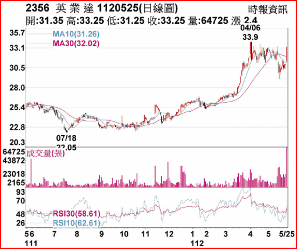 搭上AI伺服器題材,英業達近兩個月來在外資買盤持續進駐下,股價站穩3字頭,25日再受惠輝達(NVIDIA)財報優於預期、AI概念股齊揚之際,股價開高走高、終場收在33.25元波段新高,單日成交量爆增至6.47餘萬張,成交金額放大至21億元。 |