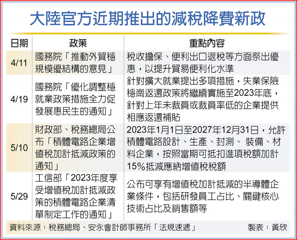 今年3月兩會以來,官方除了重申延續先前的減稅降費政策,也在逐步加碼優惠措施,以達到穩增長之效。大陸國家稅務總局5月初才針對半導體相關企業祭出增值稅加計抵減的優惠,時間從今年元旦到2027年年,企業可按照當期可抵扣進項稅額加計15%抵減應納增值稅稅額,也就是說,最高可抵扣稅額為115%。