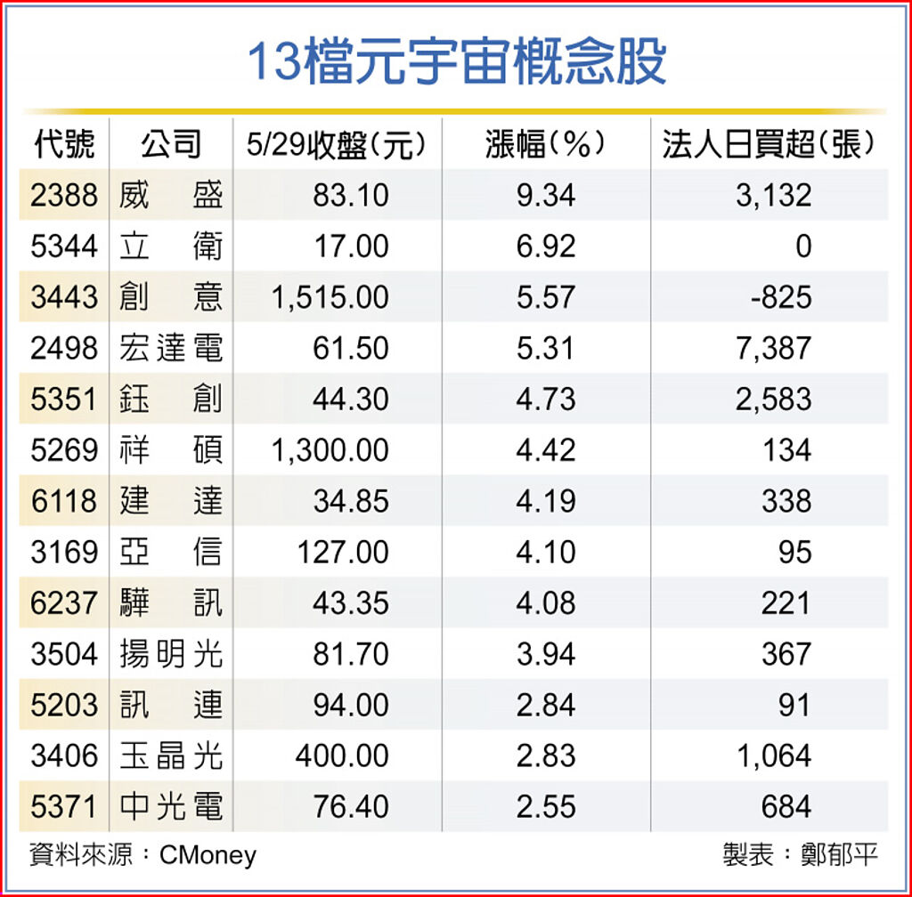 元宇宙題材29日回溫,指標股威盛、宏達電同步走強,威盛盤中觸及漲停,終場大漲9.34%並衝破季線壓力,宏達電也勁揚5.31%,兩檔個股均獲外資、自營商聯手大買,達3,132張及7,387張;此外,同屬威盛集團的立衛、建達也上漲6.92%、4.19%,創意、鈺創、祥碩、亞信、驊訊、揚明光、訊連、玉晶光、中光電漲幅則介於2%~6%。