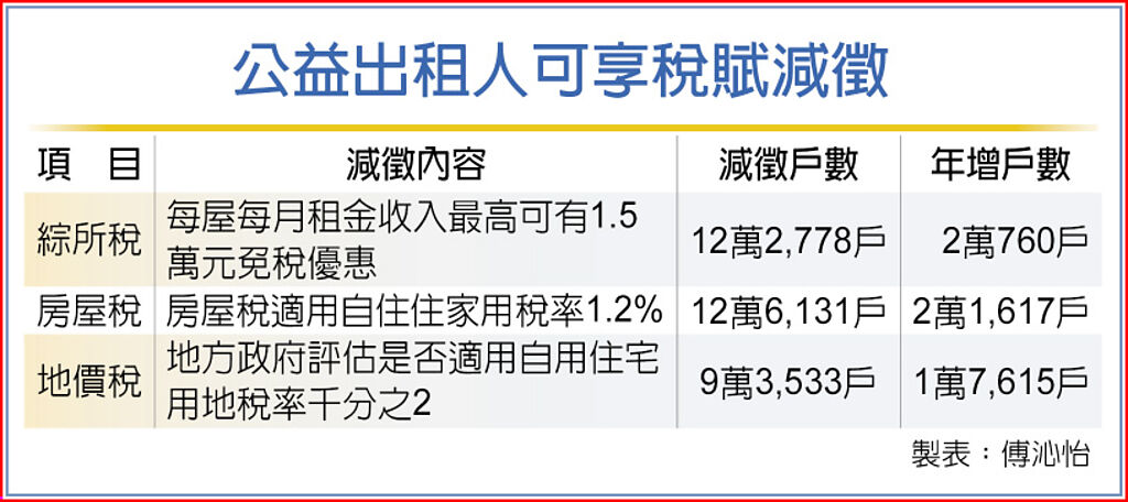 內政部表示,為鼓勵住宅所有權人出租住宅給租金補貼戶,依住宅法規定,公益出租人享有綜合所得稅、房屋稅及地價稅等三種稅賦優惠,以提高住宅所有權人提供住宅出租予經濟或社會弱勢戶的意願。