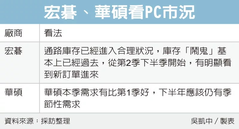 宏碁(2353)、華碩昨(1)日皆釋出PC後市正面展望。宏碁董事長陳俊聖指出,通路庫存已進入合理狀況,庫存「鬧鬼」(haunted)基本上已經過去,從第2季下半開始,有明顯看到新訂單進來,「現在有些產品我們開始追貨。」
