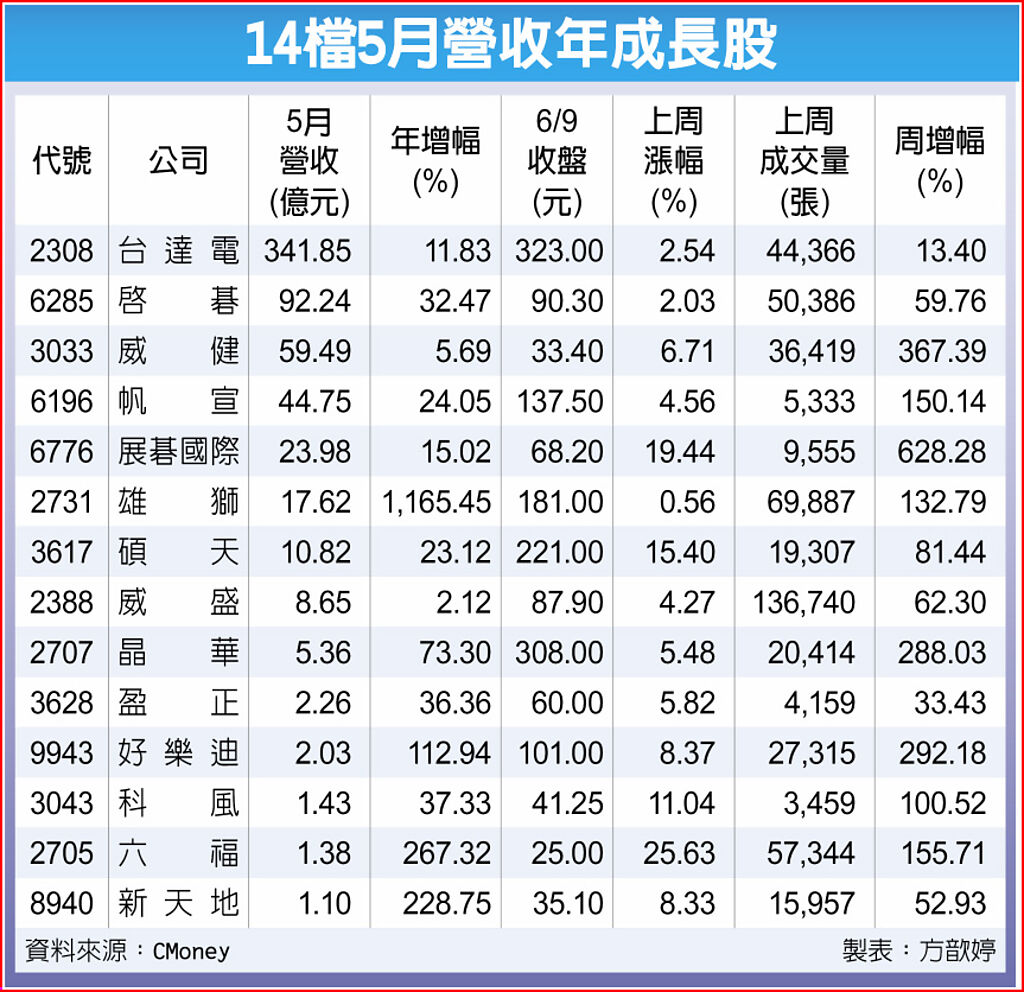 綜合來看,AI與HPC概念股、節能/儲能以及觀光旅遊,為當紅的三大強勢族群,包括台達電、啟碁、威健、帆宣、展碁國際、雄獅、碩天、威盛、晶華、盈正、好樂迪、科風、六福、新天地等14檔個股,5月營收繳年增佳績,吸引資金轉進,上周上演價量俱增的行情。