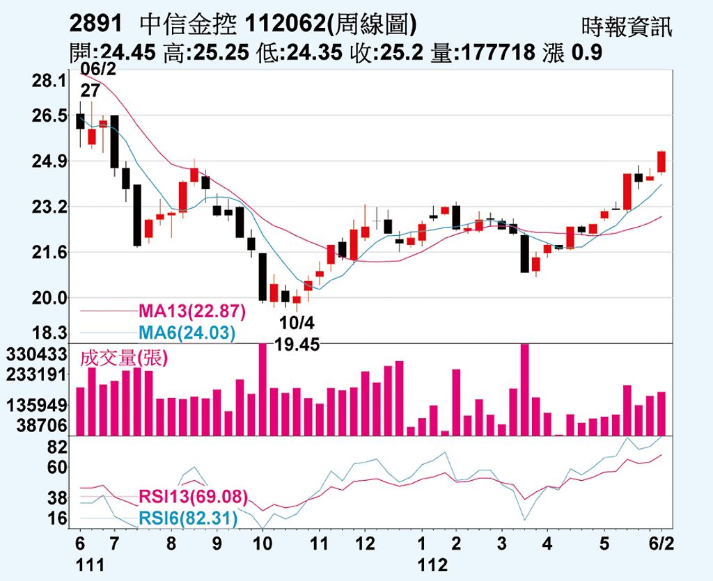 中信金9日收在25.2元、成交量50,914張、成交金額12.8億元;近五日三大法人合計買超42,303張。整周股價上漲3.7%,周線連二紅,多頭氣勢強盛,預期仍有向上空間。 |