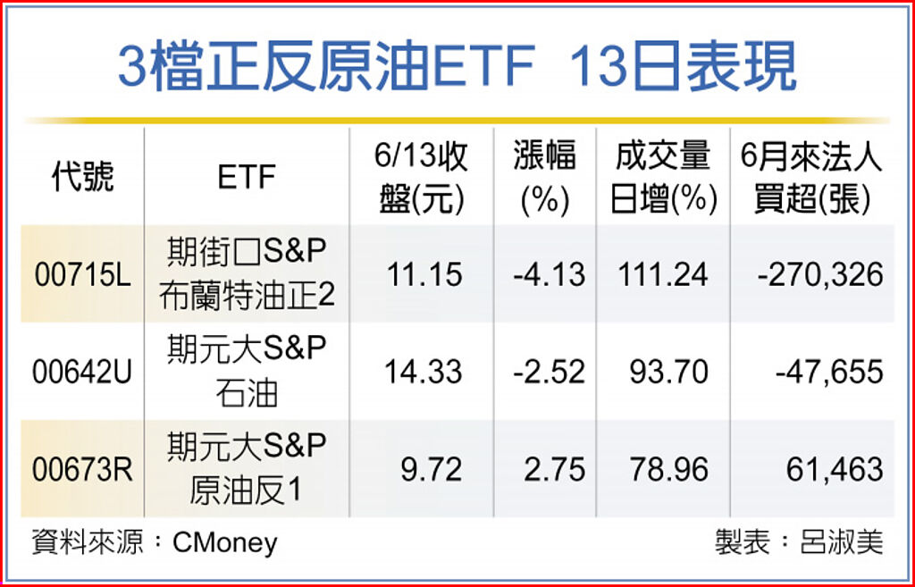 擔憂經濟前景,國際投行高盛最新研究報告大幅調降國際原油價格目標價,12日國際原油市場大跌。在證交所上市的三檔原油期ETF交投熱絡同步爆量,期街口布蘭特正2(00715L)及期元大S&P石油(00642U)爆量大跌,另代表看空的期元大S&P原油反1(00673R)爆量大漲。