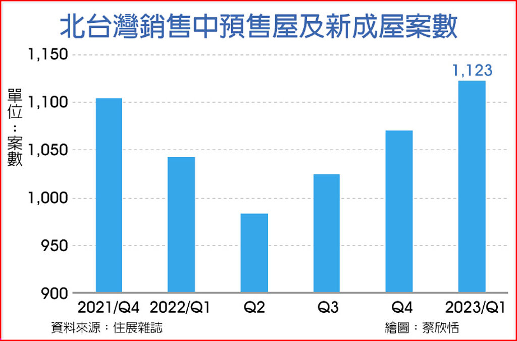 住展雜誌統計,北台灣今年第一季銷售中預售屋新案數量為1,123個,季增52個、季增幅約4.9%,已連三季成長;與去年同期相較,增加81個,年增幅約7.8%。
