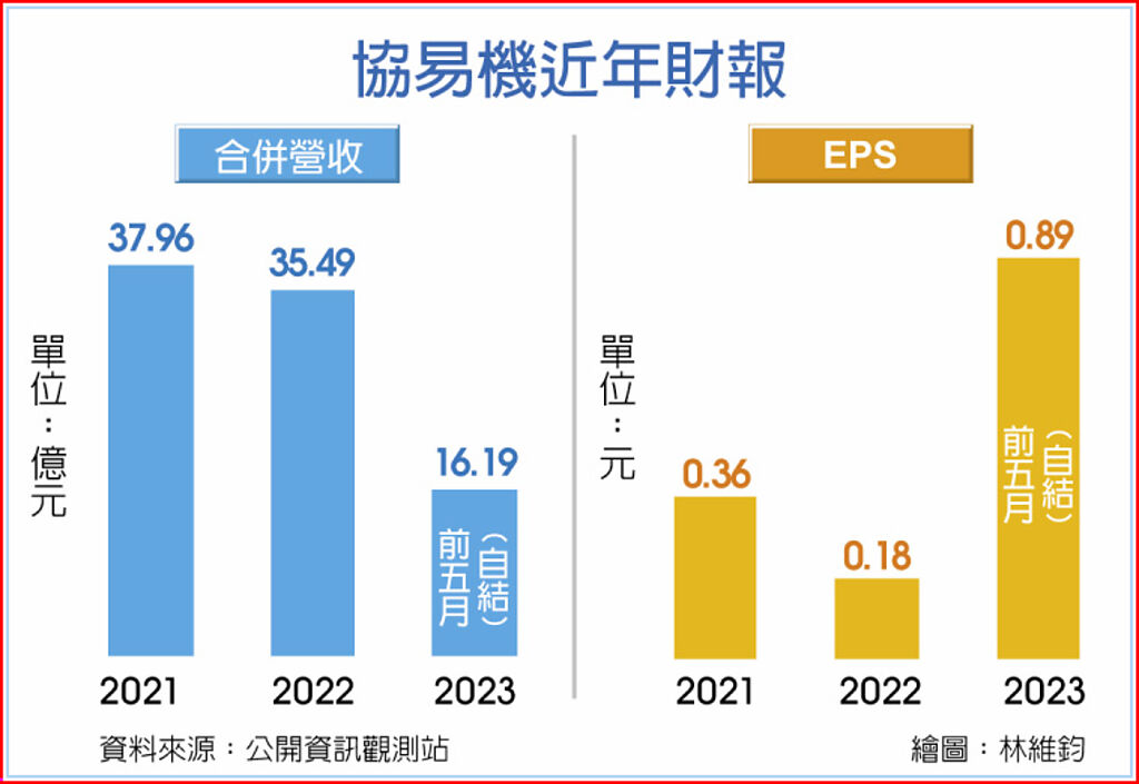 協易機21日召開股東會,通過盈餘及資本公積配息合計每股0.32元。協易機近期股價叠有表現,再度被證交所列為警示股,21日公布自結5月淨利歸屬母公司0.67億元,EPS達0.42元,不僅較去年同期轉虧為盈,還遠遠超越去年全年的0.18元;4、5月EPS合計0.59元,加上第一季EPS為0.3元,累計前五月EPS達0.89元。