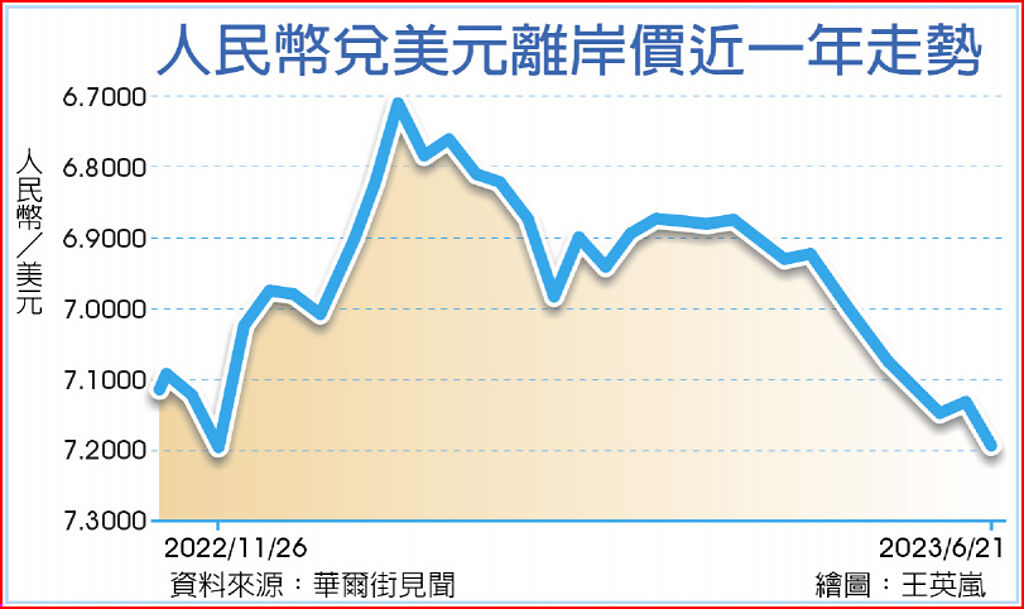 人民幣跌跌不休,兌美元離岸價21日早盤跌破7.2元整數大關,在岸價亦逼近7.2元關口,再創近七個月來新低。專家指出,端午假期前部分美元多頭獲利離場,加上市場普遍看淡人民幣,短線人民幣預料將繼續承壓。