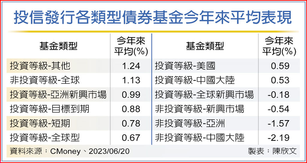 隨著通膨降溫趨勢延續,市場開始預期主要央行這波升息循環將邁入尾聲,利率風險以不若先前嚴峻,使得今年來信用債表現回穩,各主要區域投資級債券指數、非投資級債券指數、新興市場債券指數今年以來皆上漲,連帶債券基金也是漲多跌少,僅亞洲非投資級債因先前大陸房屋銷售低迷拖累,亞洲非投資級債券基金與中國非投資級債券基金平均表現落後。