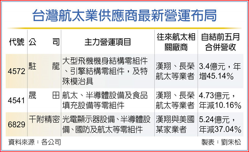 值得一提的是,駐龍及晟田均為漢翔與長榮航太供應鏈廠商,可直接受惠。駐龍前五月營收3.4億元,年增45.14%。駐龍說,波音和空巴今年交機預測,加上公司新品項訂單,陸續開發完成,並進入量產,預估今年在匯率及整體國際局勢,未有太激烈變動下,業績相較於去年仍能有顯著的成長。