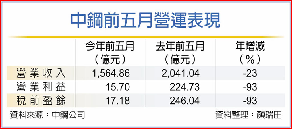 中鋼(2002)27日公布自結5月稅前盈餘8.5億元,月減10%,每股稅前盈餘0.05元,雖然鋼鐵售價及毛利上漲,但因銷量減少,加上轉投資收益、外幣兌換損益減少,以致稅前盈餘月減。展望後市,大陸鋼價浮現止跌訊號,加上國際需求自谷底反轉向上,今年8月有望築底反彈。