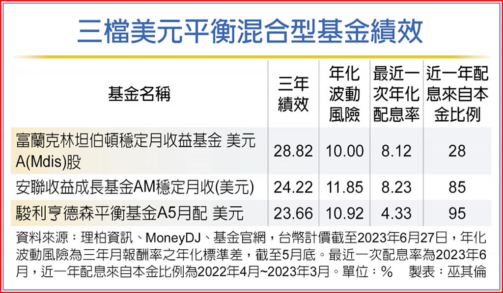 根據理柏資訊統計,檢視境外三檔美元美國平衡型基金表現,富蘭克林坦伯頓穩定月收益基金跟安聯收益成長基金的年化配息率都超過8%,其中富蘭克林坦伯頓穩定月收益基金配息來自本金比例明顯偏低,且三年績效達28.82%、波動風險僅有10%,展現攻守兼備的特性。