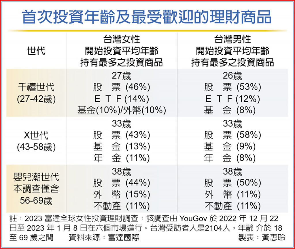 根據富達國際根據《2023年富達國際全球女性投資理財調查》報告顯示,儘管個人財務信心隨年齡增長而提升,台灣千禧世代女性(1981~1996年出生)僅35%對於個人財務有信心,低於同世代男性的44%,也就是台灣千禧世代只有4成對個人財務具信心。