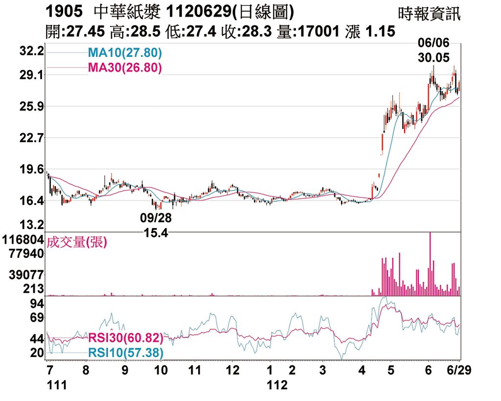 華紙(1905)二度挑戰30元整數關卡失利,股價連二個交易日拉回,一度跌破月線關卡,所幸在多方29日急補量下,推升股價上漲4.23%、收在28.3元,不僅重新站上月線,連5日線也同步收復,成功挽救瀕臨翻空的走勢。