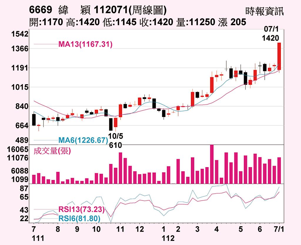 儘管大股東逢高調節持股,緯穎(6669)股價仍接連創高,繼6月29日以1,295元漲停收盤後,30日再拉出第二根漲停板,並寫下1,420元新天價,周漲幅16.9%。累計外資法人單周調節逾千張持股,不過投信法人則勇於承接,單周買超947張。