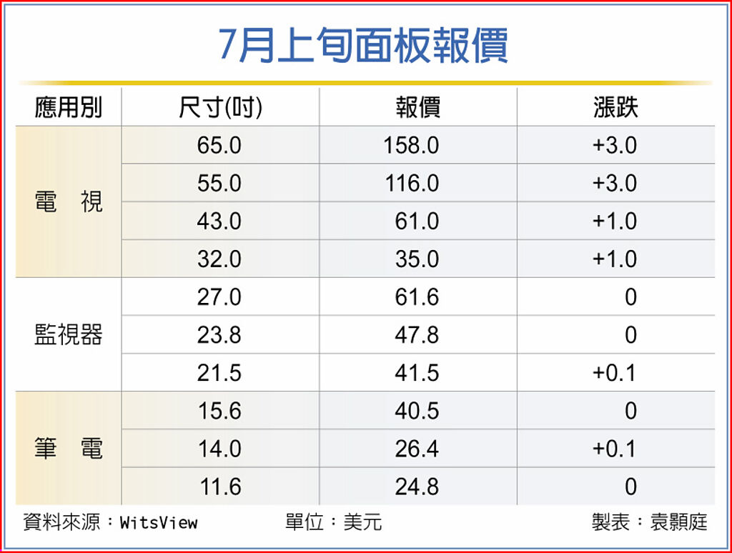 從電視面板報價來看,32吋、43吋面板在7月上旬小漲1美元,均價分別來到35美元、61美元,55吋、65吋面板則是調漲3美元,均價分別為116美元以及158美元。