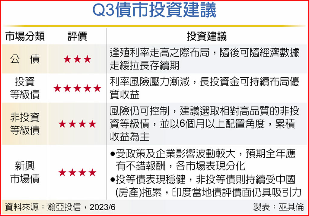 美國聯準會(Fed)升息循環有望在第三季結束,債券投資價值浮現。投信建議,因投資等級債擁有高利率、高評等及低價格等三大優勢,可列第三季的核心配置,非投資等級債在違約率偏低下也可開始建置部位,但因景氣下行風險尚未消弭,建議投資人應選相對高品質的債券作為持有標的。