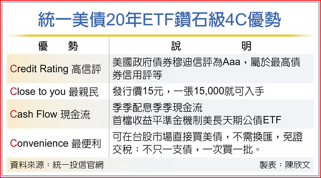 「鑽石級4C」策略著眼投資人最關心的四大面向,即高信評(Credit Rating)、最親民(Close to you)、現金流(Cash Flow)、最便利(Convenience)。統一投信強調,訂於7月17日至19日募集的統一美債20年ETF(00931B),可說完全符合「鑽石級4C」特質。