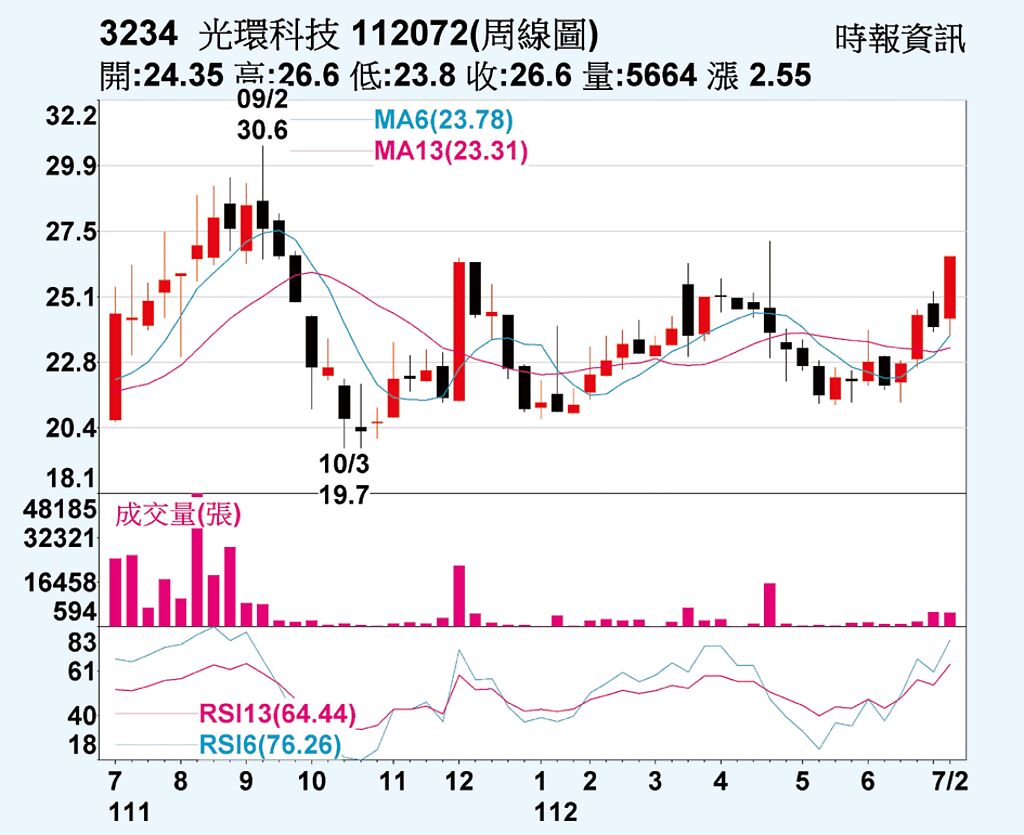 光環(3234)7日股價盤中突然發動攻勢,急拉至漲停板價26.6元,並強勢鎖住直到終場。觀察三大法人動向,本土法人皆無著墨,僅外資買超180張。光環6月營收營收5,027萬元,年減37.28%、月減0.79%,累計1至6月營收2億8,982.6萬元,年減48.55%,業績尚未見到回升。