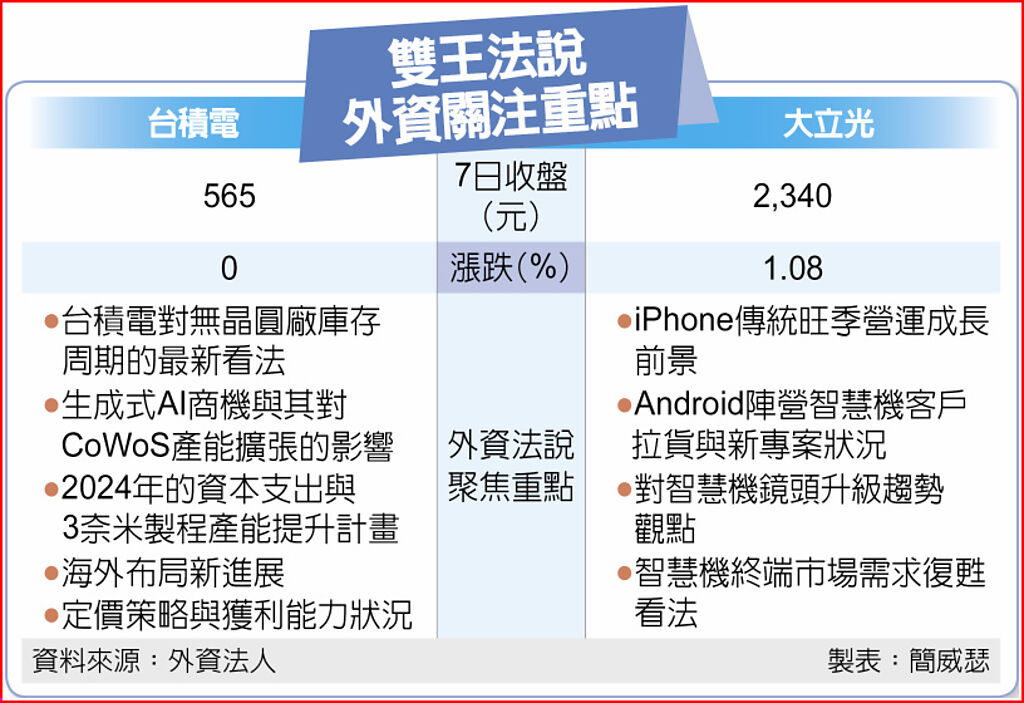 光學族群股王大立光、晶圓代工龍頭台積電,相繼於13日、20日召開第二季法說會,外資提前鎖定市場高度關注焦點;台積電法說聚焦庫存、生成式人工智慧(AI)等五大面向,而對大立光則鎖定營運下半年復甦力道、規格升級等議題,吹響台股法說會旺季號角。