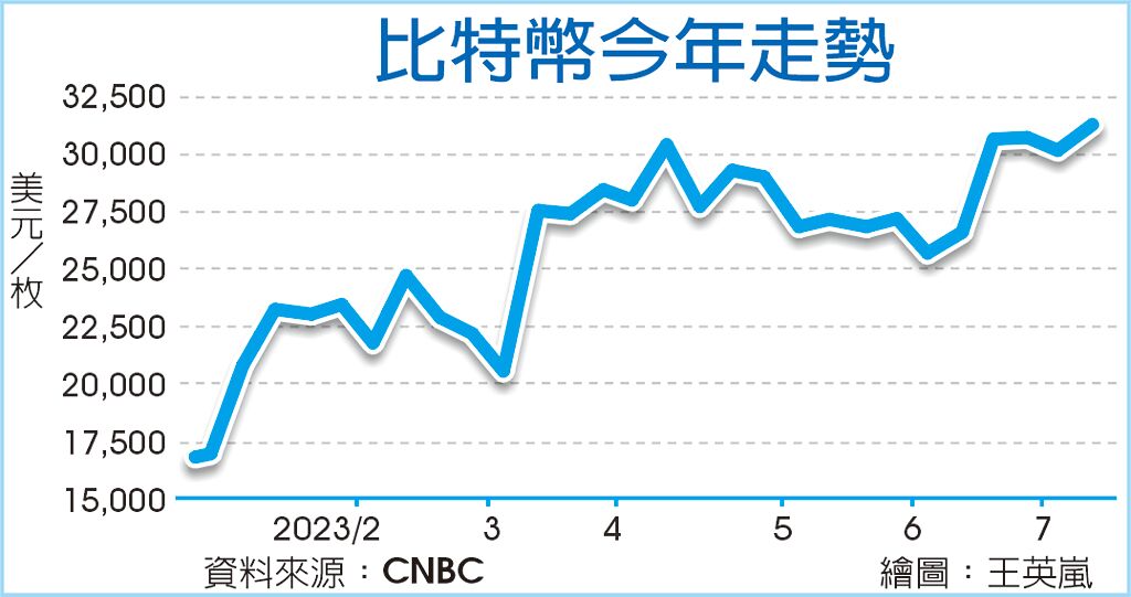 比特幣13日每枚上漲逾3%,創逾一年新高,14日盤中回跌0.5%報31,214美元。紐約法院裁決瑞波幣(XRP)「從表面來看並不必然是證券」,推翻證交會(SEC)部分指控,刺激瑞波幣13日狂飆逾70%,帶動包括比特幣等加密幣價格走高。隨著瑞波幣14日盤中回跌近4%,整體加密幣行情跟著降溫。 |