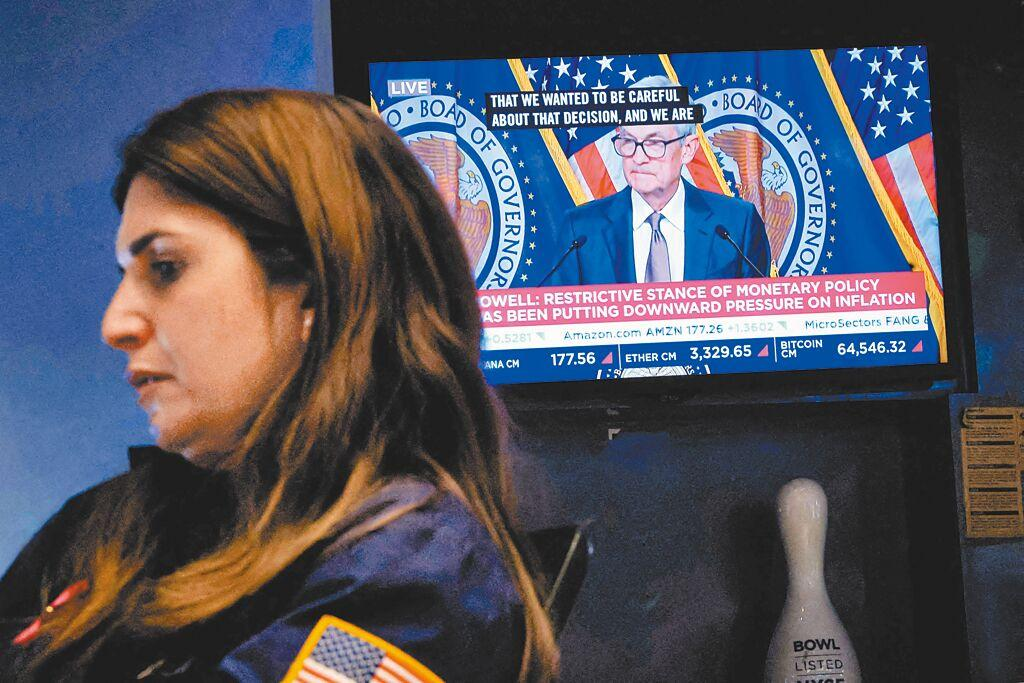 美國聯準會(Fed)官員放鷹,表示今年可能不降息,美股重挫連4天收黑。圖為紐約證交所大廳螢幕播放Fed主席鮑爾記者會。(路透)