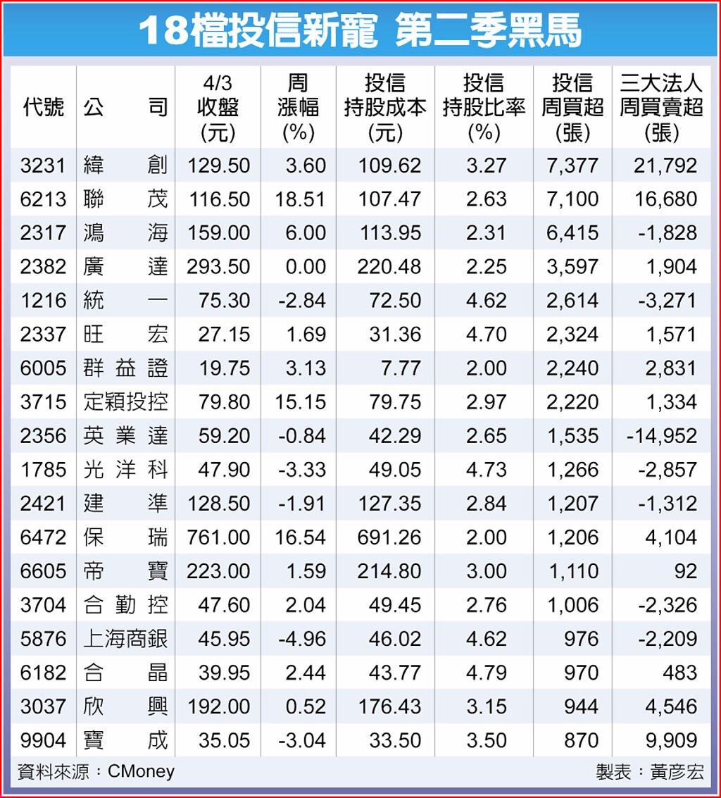 時序邁入第二季,法人競相展開台股新布局,加權指數3日適逢清明連假前夕、大規模地震導致指數回測震盪,惟市場專家仍預期多頭格局延續下,台股走勢將逐漸回穩,由於投信第一季底作帳與結帳行情告一段落、大規模ETF建倉完畢,4月可鎖定投信持股仍低於5%,且積極買超囤貨的「第二季新寵股」,計有廣達、聯茂、寶成等18檔,作為投資布局的參考。