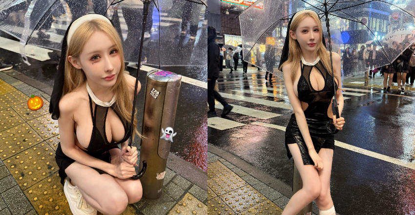 台灣這幾年也越來越注重萬聖節,許多地方都會舉辦變裝派對,但也有不少人選擇到國外感受氣氛。東京澀谷每年萬聖節周末,都會舉辦變裝遊行,JKF女郎Yui潔兒今年也到場共享盛舉,她化身暗黑修女,不僅爆乳還露出修長美腿,只是澀谷當天下雨,Yui潔兒原本扮當受傷的女優色色一波,卻變成瑟瑟發抖。