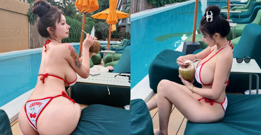 最近天氣越來越冷,不少正妹都動身前往東南亞避寒,延續夏天的比基尼!JKF女郎艾妃aifei最近也到泰國蘇梅島度假,她換上了有櫻桃圖案的比基尼,只是那點布料根本罩不住她豐滿的I罩杯,加上她手拿椰子對比,第一次看到有櫻桃比椰子大的啦!