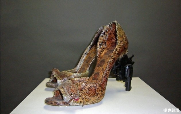 德國設計師Iris Schieferstein用死去的動物標本,包括馬、蛇與鴿子等,製成特殊的鞋子,看起來就像把動物穿在腳上。