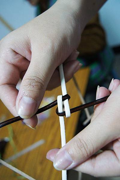 而在陳媽媽談笑風生的愉快氣氛下,我們開始了最簡單的田字結的編織