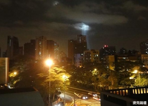 在客廳休息的時候,23點50分突然發現窗外不遠處奇特光束從上而下直射下來!將周邊的云彩照的通亮!持續了3分鍾左右時間,興奮至極趕緊拿來相機拍攝,最后發現照片上不遠處還有一紅色不明飛行物若隱若現!