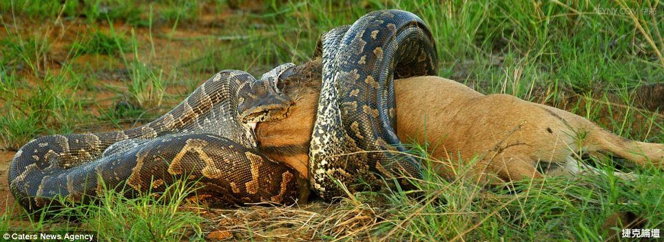 卻從來沒有見過「非洲岩蟒」吞食這麼大的獵物,儘管這頭牛羚只是2個月左右的幼仔。
