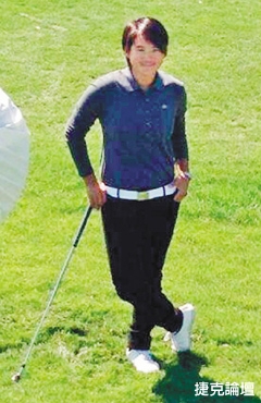 輕靠著球桿,台灣高球好手曾雅妮頂著加州豔陽笑得燦爛。
