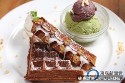 除了咖啡,還要推薦超特別的「麻糬鬆餅」,酥脆的鬆餅搭配Q黏的麻糬,衝突口感令人驚喜!鹹食有「約克夏拖鞋麵包」,用料豐富加上份量充足,男生陪女朋友一起去也吃得飽喔。