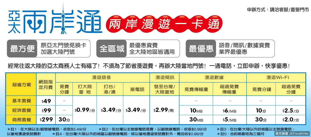 經常往返大陸的亞太商務人士有福了!不須為了節省漫遊費,再辦大陸當地門號! 一通電話,立即申辦,快享優惠!