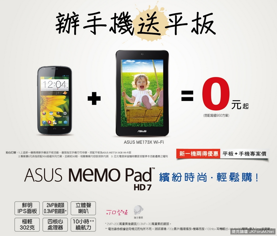 亞太電信新一機兩得活動辦手機送平板,僅限指定手機方可申辦,搭配平板為ASUS ME173X 8GB WiFi版。