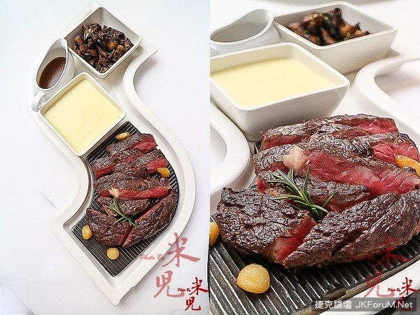 就是這個造型獨特的呈盤,讓這裡的牛排看起來與眾不同,辨識度極高!上桌時同時搭配了細滑的洋芋泥與炒蘑菇,以及濃縮肉汁,搭配牛排食用。