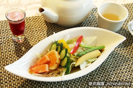 副菜(配菜)蛤蠣、香菇與肉末軟綿的『茶碗蒸』,入口即化;高雅清脆的『蘋果焗烤』,上層烤得焦黃的起士,一上桌香味四溢,鮮奶油風味的蘋果濃湯,送到嘴裡清新可口;填飽肚子的『櫻花蝦炒飯附漬物』,顆顆分明的快炒炒飯灑上炒過櫻花蝦,份量剛好,吃完炒飯後喝上一碗熱騰騰養生的『日式味噌湯』,豆腐海帶芽細火熬燉,排除油膩的健康聖品,加上當季的餐後水果和洛洛神花的『金鑽冰沙』(可續杯)。