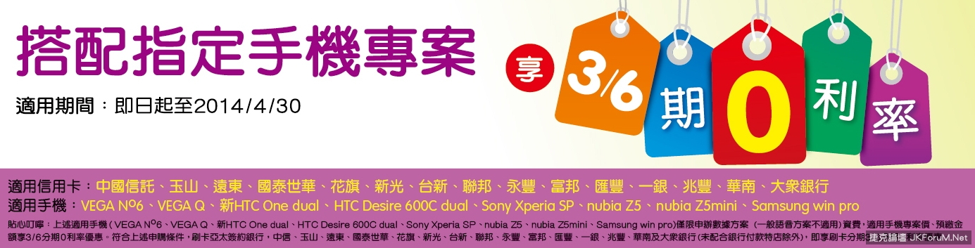 即日起至2014.12.31於亞太電信全省門市消費,持玉山銀行信用卡不限金額即享有三/六期分期零利率優惠(未配合玉山銀行付款特店除外)