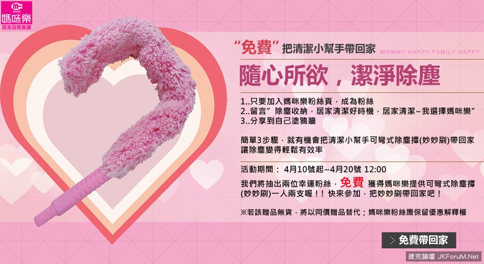 活動期間: 4月10號起~4月20號 12:00 我們將抽出兩位幸運粉絲,免費獲得媽咪樂提供可彎式除塵撢(妙妙刷)一人兩支喔!! 快來參加,把妙妙刷帶回家吧!
