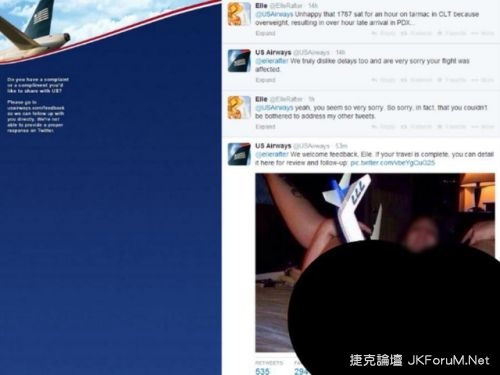 根據中央社報導,一名來自波特蘭的婦人艾兒.賴夫特(Elle Rafter),14日透過推特向全美航空(US Airways)抱怨航班誤點,雖然全美航空官方推特帳號親切回覆「我們歡迎各方意見,艾兒。如果妳的旅程已經完成,請按以下連結洽詢更多詳細內容。」