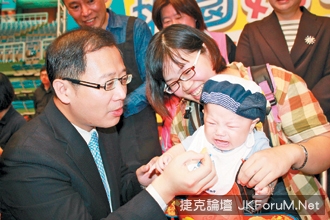 吳志揚昨天在會場為6名4個月大的新生兒收涎,祝福每個小寶寶順利長大成人,儀式上有嬰兒突然放聲大哭,逗笑現場民眾。