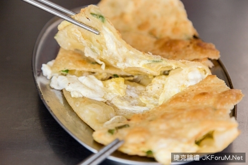 即然這家有名的是蛋餅,那麼小虎就來仔細的觀察一下蛋餅的作法。首先把打開的蛋倒入再灑上蔥花,這點和台灣的蛋餅作法是一樣的。