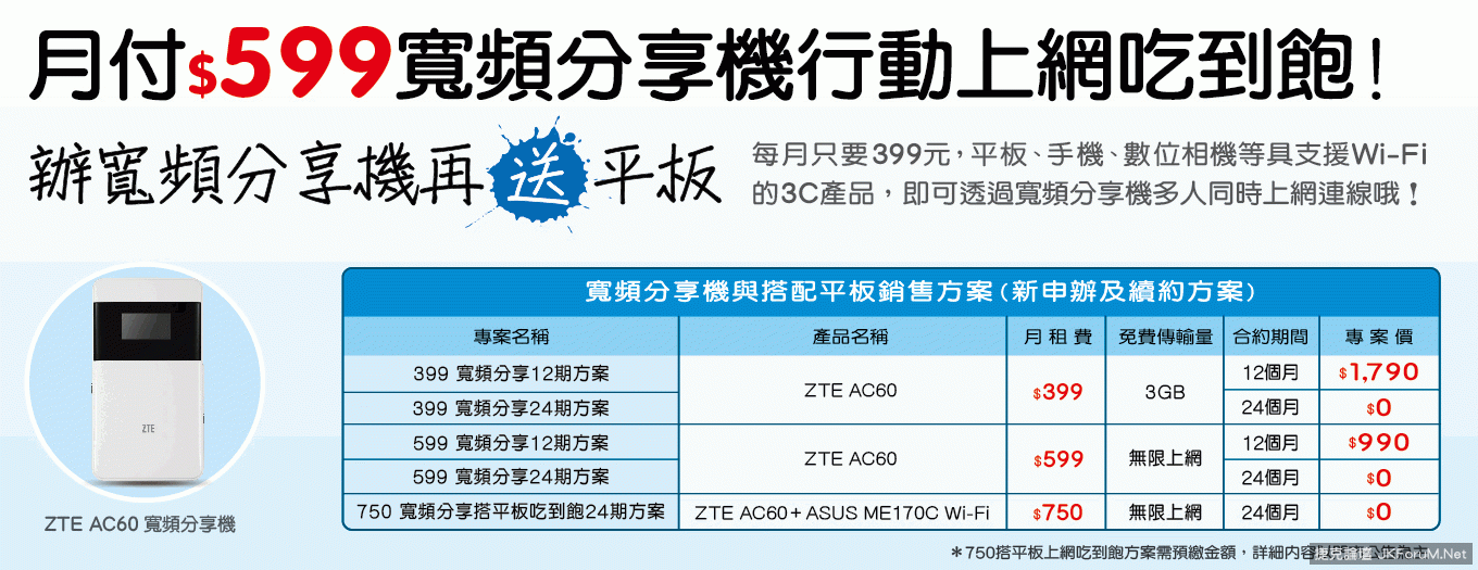亞太電信月付$599寬頻分享機行動上網吃到飽 辦寬頻分享機再送平板