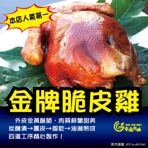 本店人氣第一「金牌脆皮雞」 外皮金黃酥脆,肉質鮮嫩甜美,從醃漬→燻皮→風乾→油淋熟成四道工序精心製作。